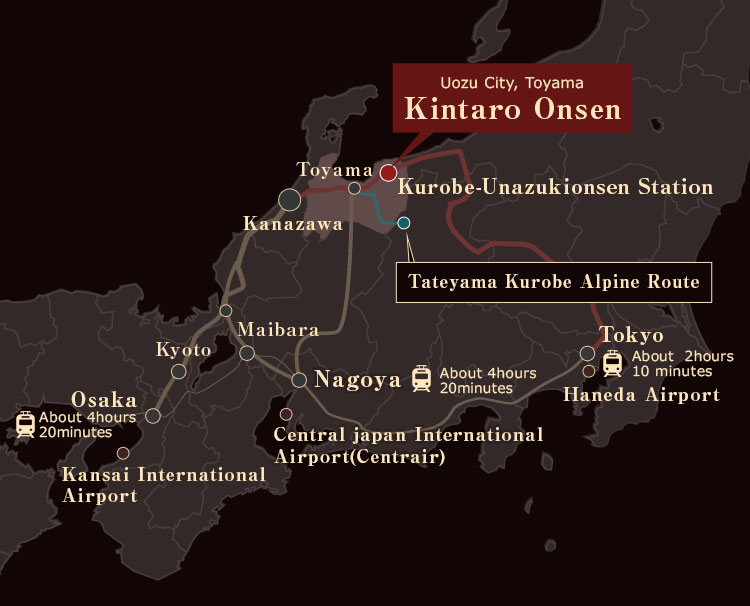 “Kintaro Onsen” is situated about 10 minutes by car from Hokuriku Shinkansen Kurobe-Unazukionsen Station.