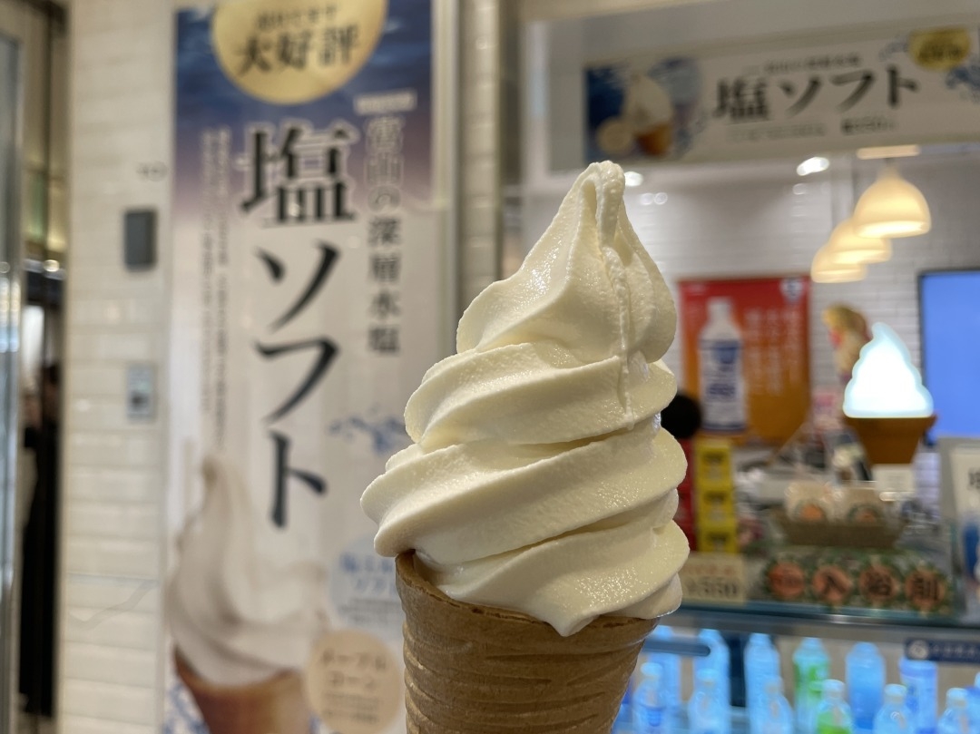 こんにちは、とやまめぐり編集部の曽我です。今回ご紹介するのは富山駅前の「とやマルシェ」に入ってすぐ左側にある「GOSHU」の「塩ソフトクリーム」です。