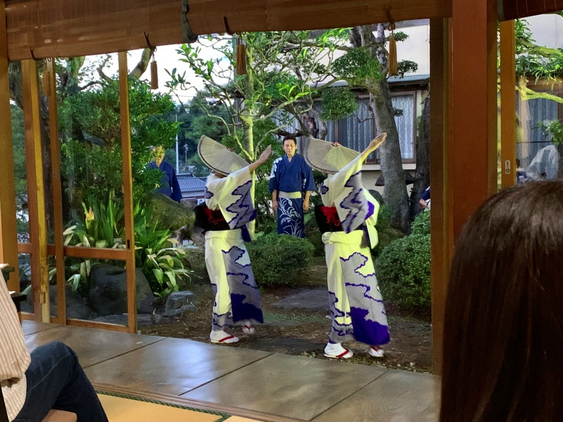 好天時はお座敷から幻想的なお庭でのおわら、雨天時は屋内での更に間近なおわらをご覧いただけます。