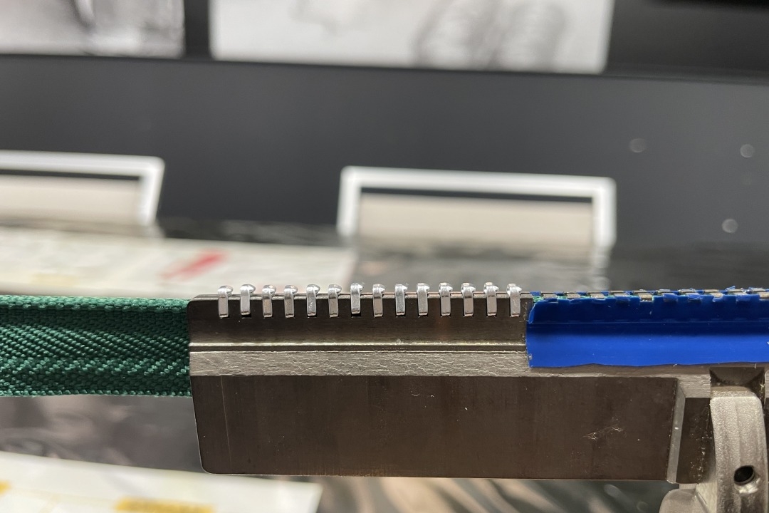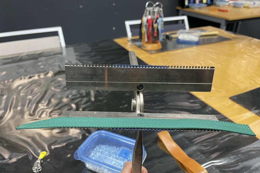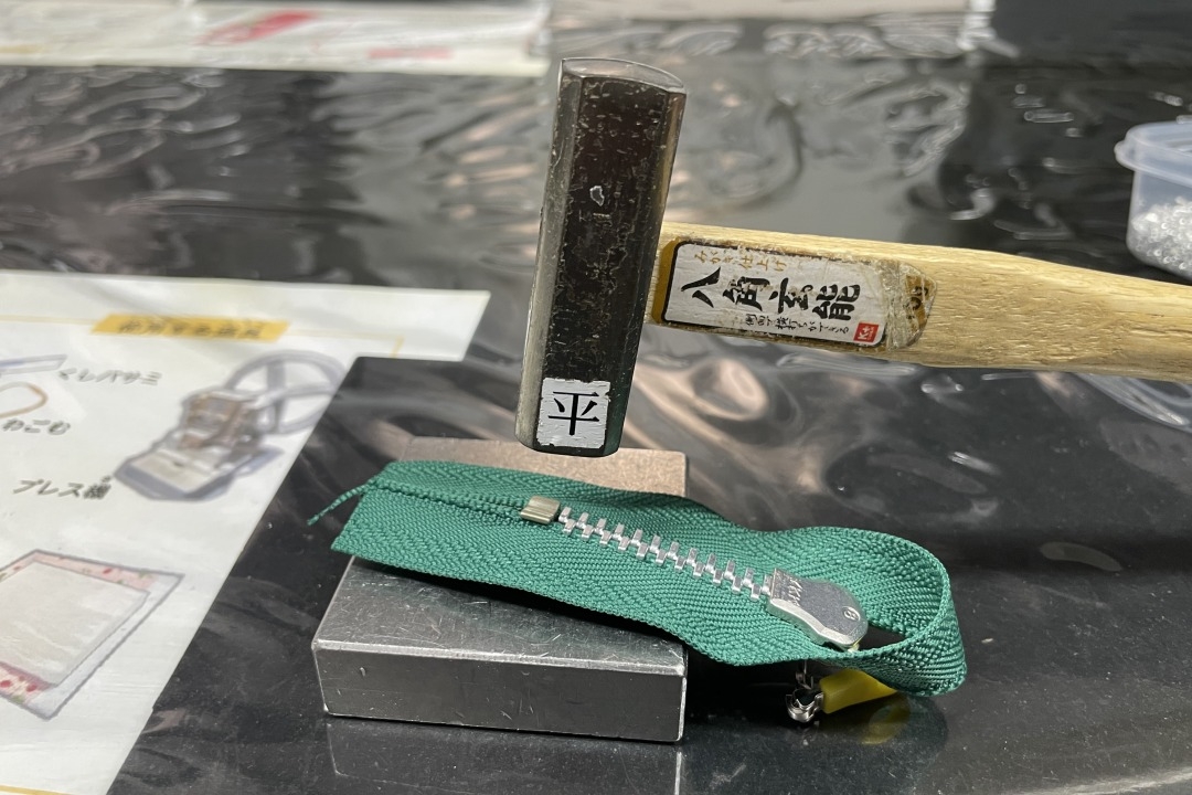 展示を見た後は「ファスナー手作り体験」へ。ガイドさんが、たくさんあるテープを出してくださり好きな色柄を選ぶことからスタート。その後、エレメントという小さな器具をひとつひとつ並べ、プレス機で押していただき、トンカチで上留めと下留めを叩いて完成させました。どの作業も興味深く、とても楽しかったです。