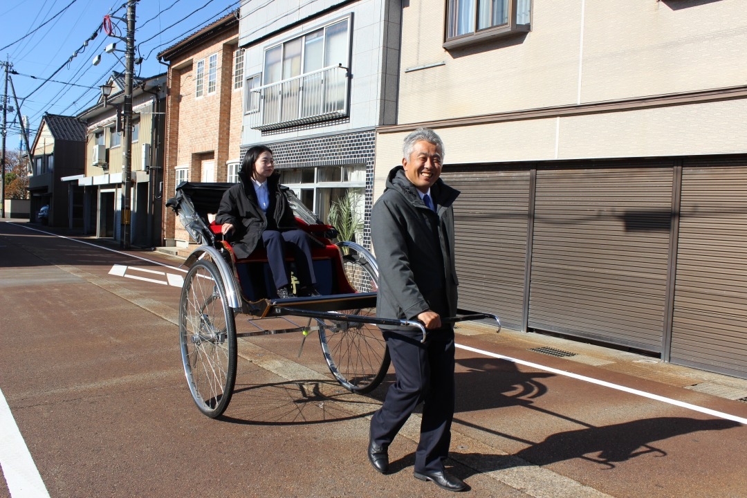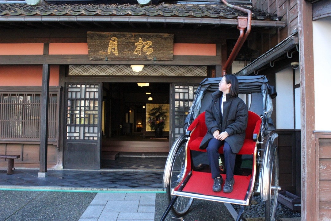 続いては、本日のメインイベント、浦崎さんおすすめの料亭「松月」に行きました。お店の前には人力車があり、持ち主の方のご厚意で乗らせていただきました。