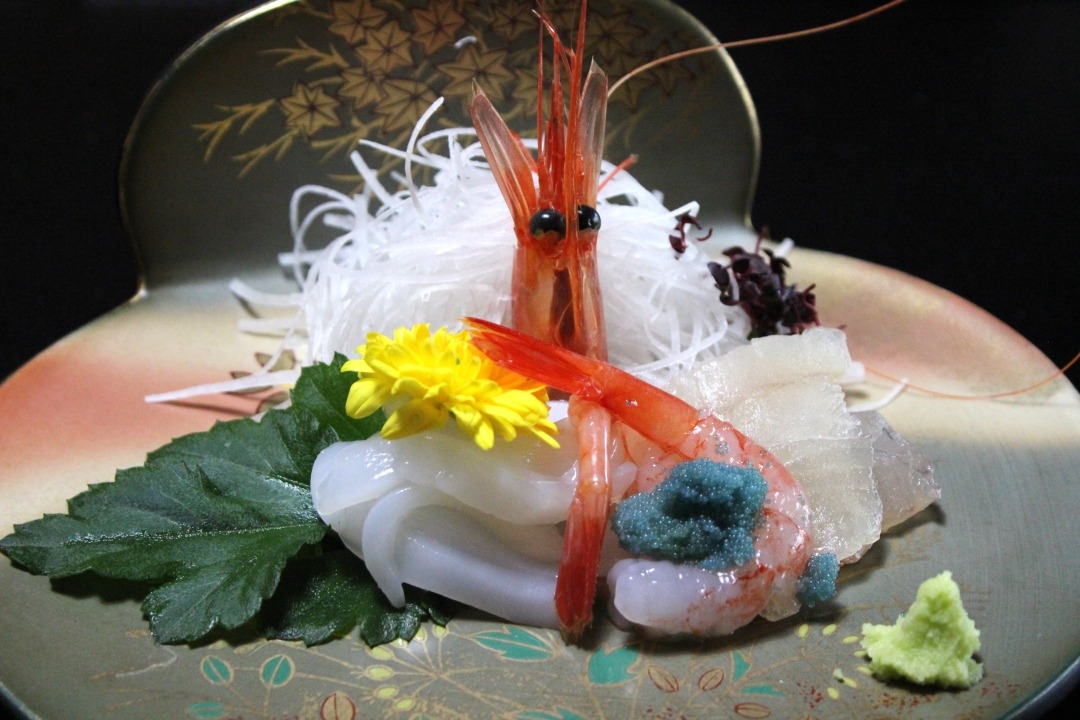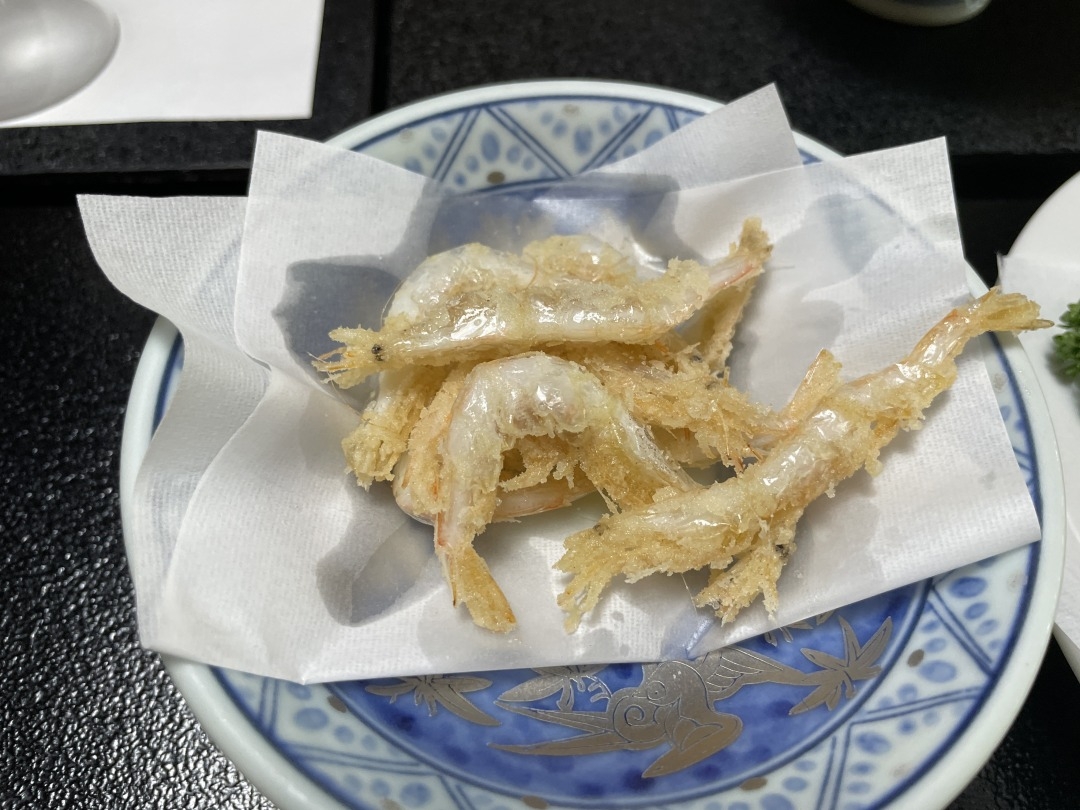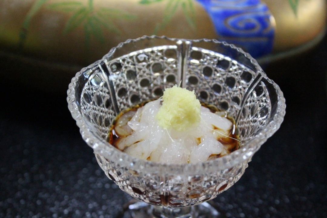最初にいただいたのは、タイ、ヒラメの昆布締め、アマエビ、アオリイカのおつくりです。富山湾の旬がつまっていて、本当においしかったです。白エビのおつくりは、なんと40匹入っているそうです。ショウガをつけて食べてください、とのことでやってみたところ、ショウガにより白エビの甘さがさらに引き出されていました。他に、どれを食べてもおいしく、至福の時間になりました。