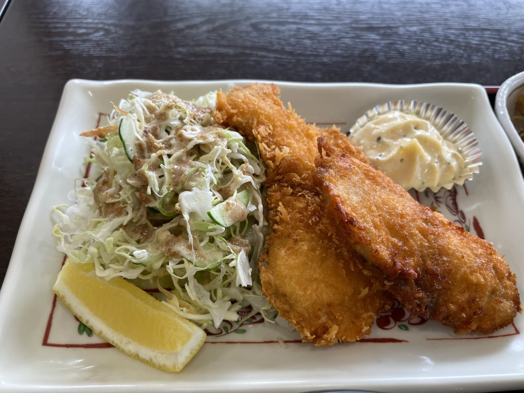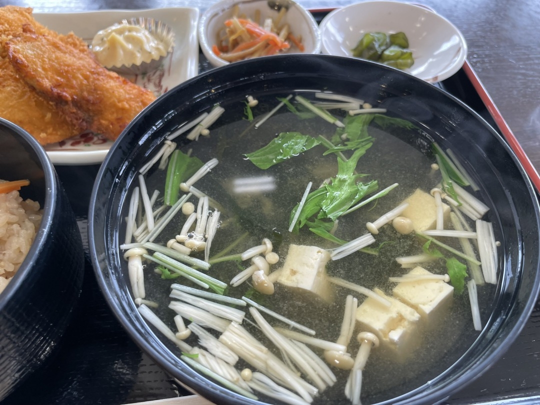 「バイ飯」とは、バイ貝という北陸地方でとれる貝が入った、炊き込みご飯。絶妙の炊き加減のご飯は、貝のうまみが濃縮されており、口に入れるたびに幸せな気持ちが広がりました。バイ貝もたっぷり入っていて、さすが漁師飯!と感動しました。魚のフライ(この時はサワラと、ブリの幼魚の「フクラギ」)も絶妙の揚げ方でした。おつゆは驚きのどんぶり入りでしたが、昆布のお出汁がきいていて、気づいたら完食していました!