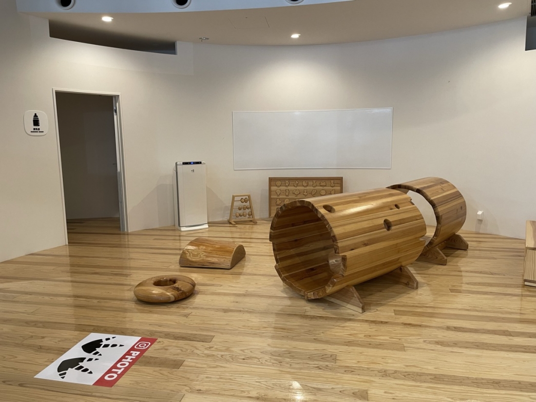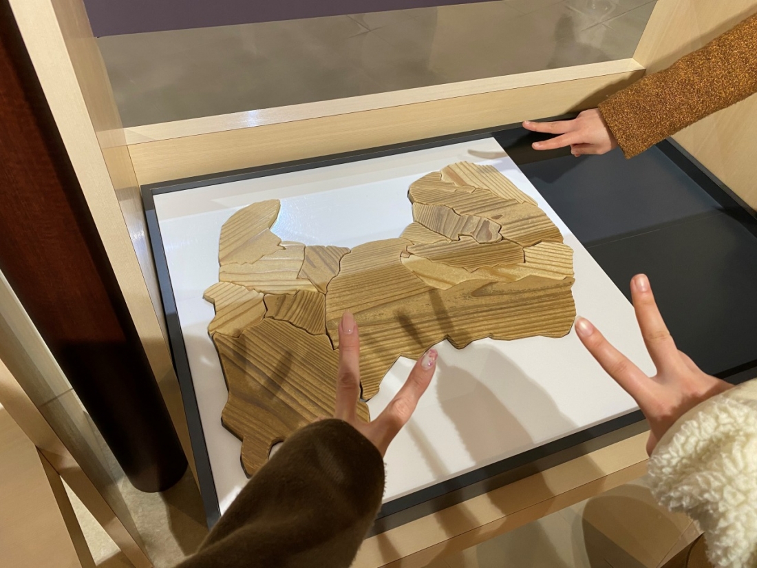 チケット受付の近くには、子ども向けのキッズスペースがありました。木でできた富山県の地図のパズルもあったのですが、意外に難しかったです。どうにか完成!