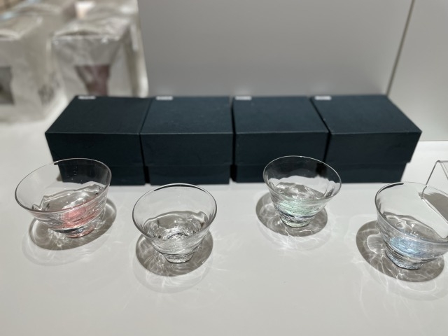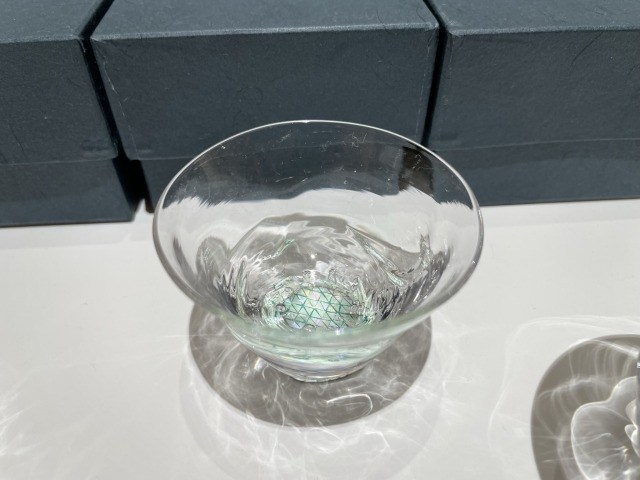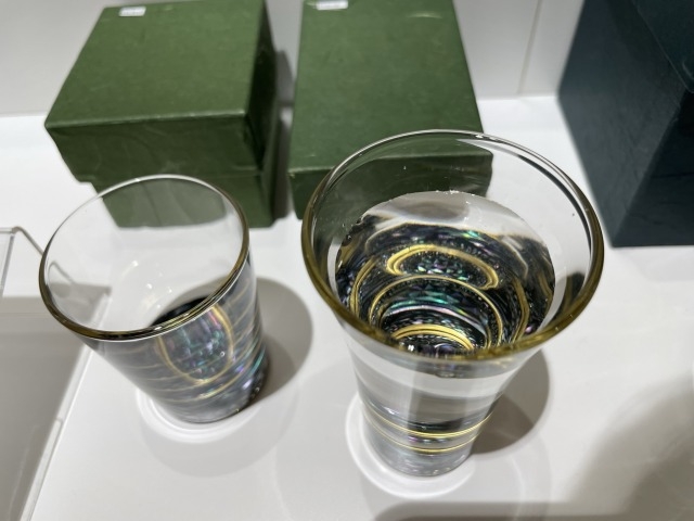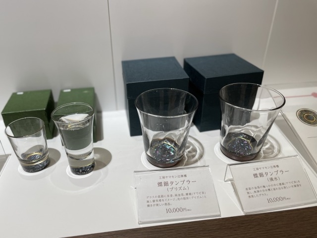 大正2年の創業以来、魚津市で仏壇仏具の製造を手掛けていた「工房ヤマセン辻佛壇」が手掛けるグラス類も人気を博しています。特に多くの人が手に取っているのは、美しい螺鈿(らでん)細工が底に施された「螺鈿タンブラー」や「halo」などのグラス類。水やお酒をいれると、底の装飾の美しさが際立ちます。