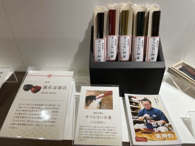 魚津は漆が盛んだった地域ですが、徐々にお店が少なくなり、今では「鷹休(たかやすみ)漆器店」が市内にある唯一の漆器店となりました。このお店が大切にしているテーマは「堅牢・安価・実用的」であること。長く使えそうなものがそろっており、自分のお土産にするのはもちろん、大切な人へのプレゼントにも良さそうです。