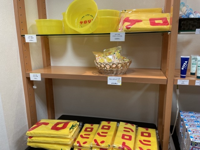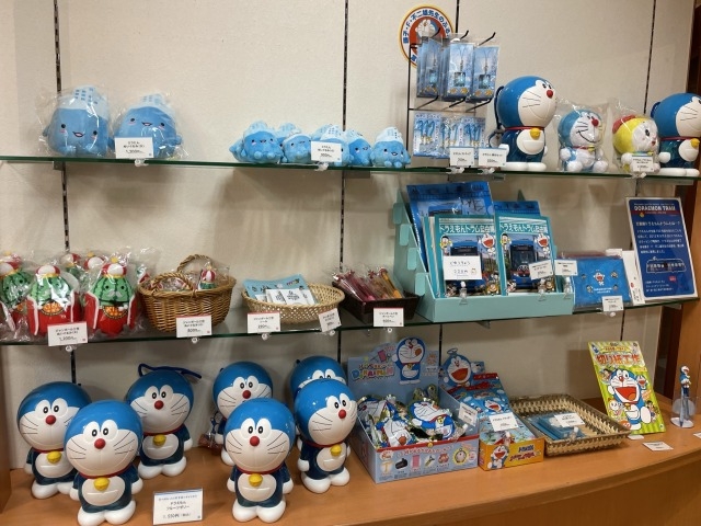 「北前船」のご当地キャラのコーナーには、魚津市の「ミラたん」、入善町の「ジャンボ~ル三世」や、ドラえもんのグッズが集められています。「ケロリン」のお風呂グッズも、富山ならではのグッズ。サウナやお風呂好きの方へのお土産にぜひ!
