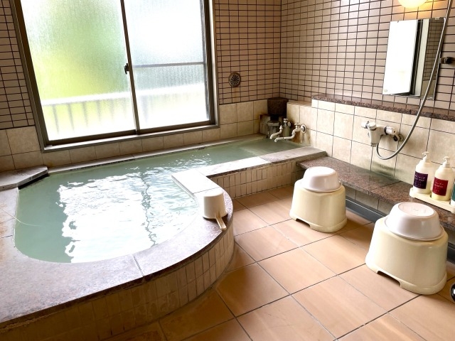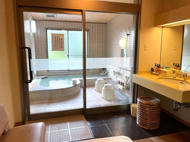 家族でのんびり入りたい方は、こちらの家族風呂の利用がおすすめ。脱衣所にはトイレもあるので、小さなお子様連れで、急に「トイレ!」と言われた時も安心です。洗面台も広々しています。