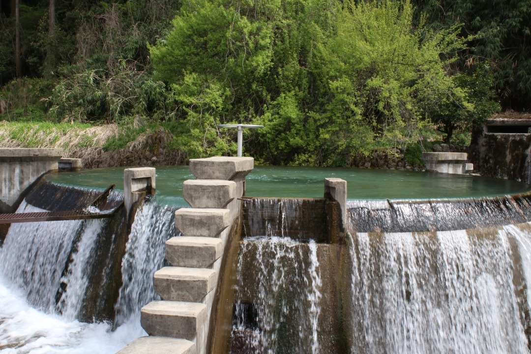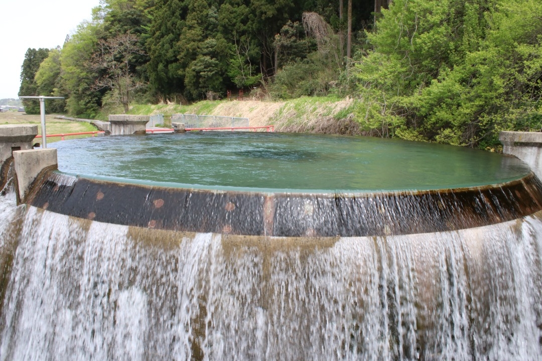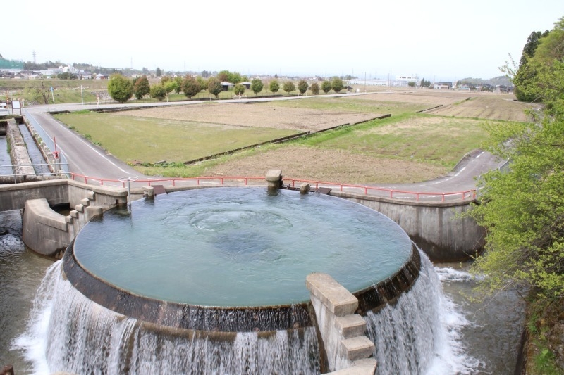 近づいてみると迫力満点で、水の流れる音が心地よかったです。まわりや畑や山に囲まれており、ベンチもあるので休憩にも良いスポットです。