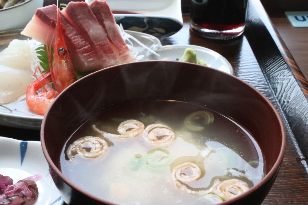 魚津漁協が経営しているだけあって、お魚は新鮮そのもの。私は今回「刺身定食」を注文したのですが、ブリ、ヒラメ、クルマダイ、甘エビが提供されました。とれたてで、魚に弾力があり、もちろん生臭さは皆無。つけあわせが薄味で、魚のおいしさを引き立ててくれた点にも感動しました。また、魚の出汁がきいたみそ汁も絶品で、ごはんの炊き加減もばっちりでした。