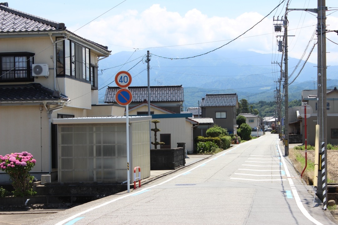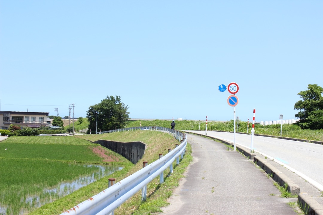 こちらのコースのスタートは、下り坂です。降りてすぐに、meu tempoを横目に道路を進み、片貝川を渡りローカル気分で住宅街を走り抜けます。