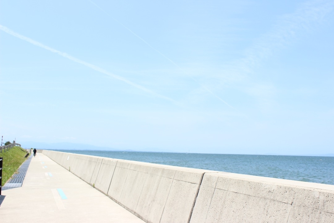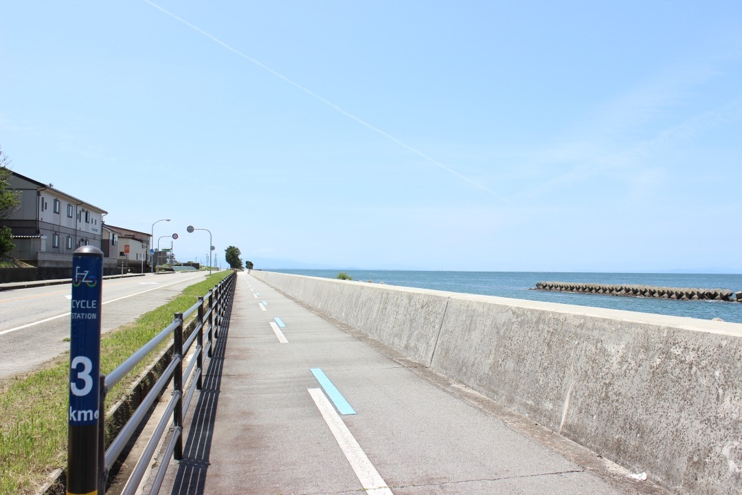 しんきろうロードは、海の真横にある道路で、舗装された自転車専用の道があるので、とても走りやすいです。目の前に空と海が広がる、絶景をひとりじめできるコースです!