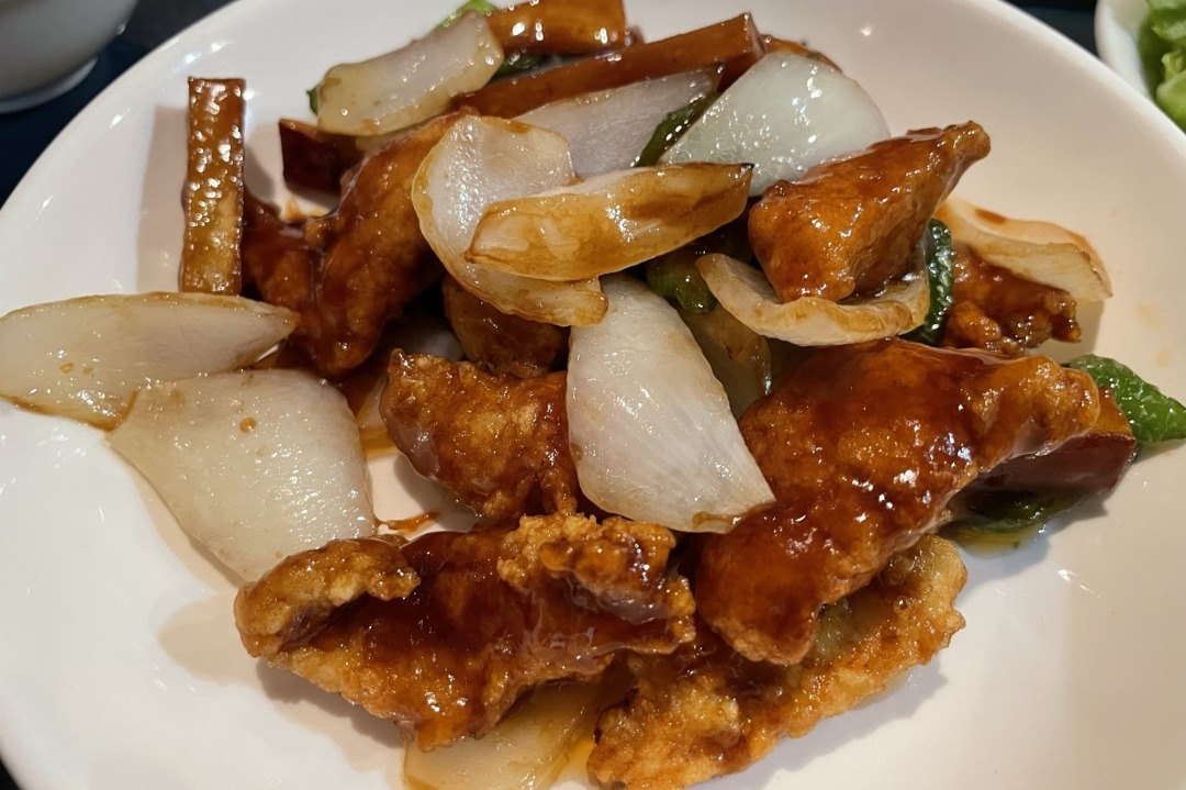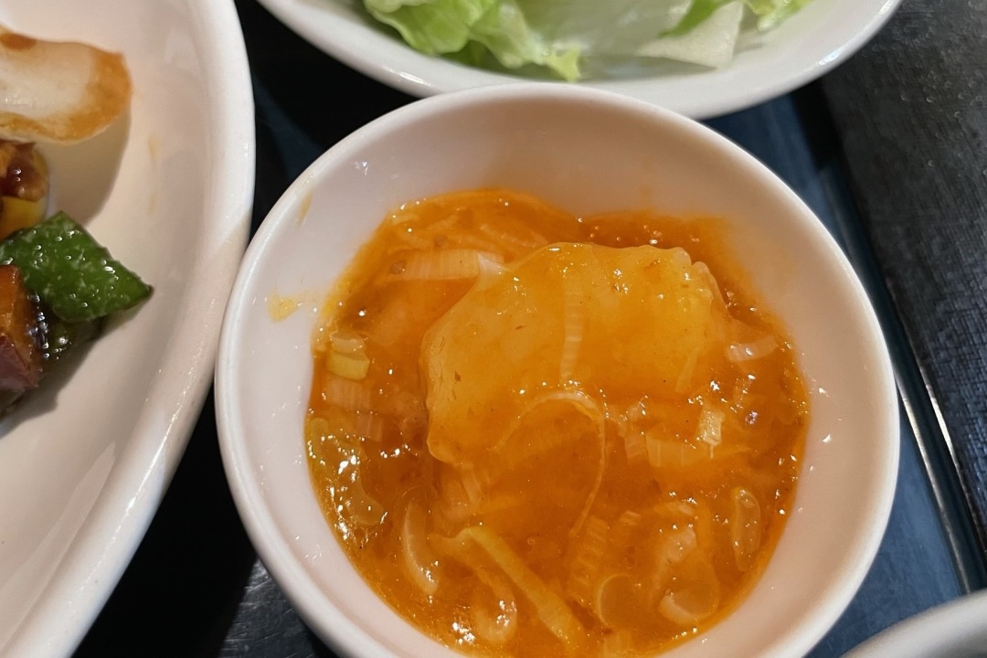 私は「揚げ鶏甘酢あんかけランチ」を注文。「揚げ鶏甘酢あんかけ」は炒め方が絶妙で、すべての具材がおいしかったです。特に揚げ鶏は鶏肉がふわふわで、「これはプロの仕事だ!」と感動しました。一緒に食べるごはんも炊き加減がばっちりで、おかずとの相性が抜群でした。スープも、さっぱり風味で良かったです。さらに副菜は、エビチリ2個! エビ好きには嬉しい大きめサイズで、幸せな気持ちになりました。