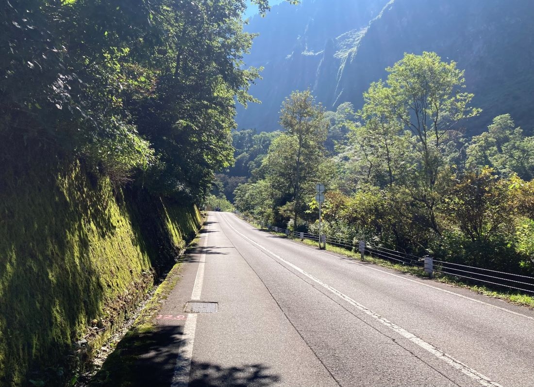 立山駅の踏切を渡り称名川を越えると、右に曲がり、あとはひたすら直進です。行きは上り、帰りは下りになります。