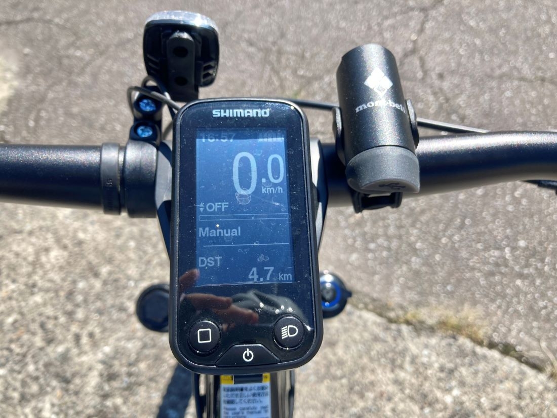 レンタルできる自転車は、モンベル社製の電動アシスト付マウンテンバイク。ヘルメットとグローブも貸し出していただけました。本格的な自転車と装備に、ワクワクが高まります!