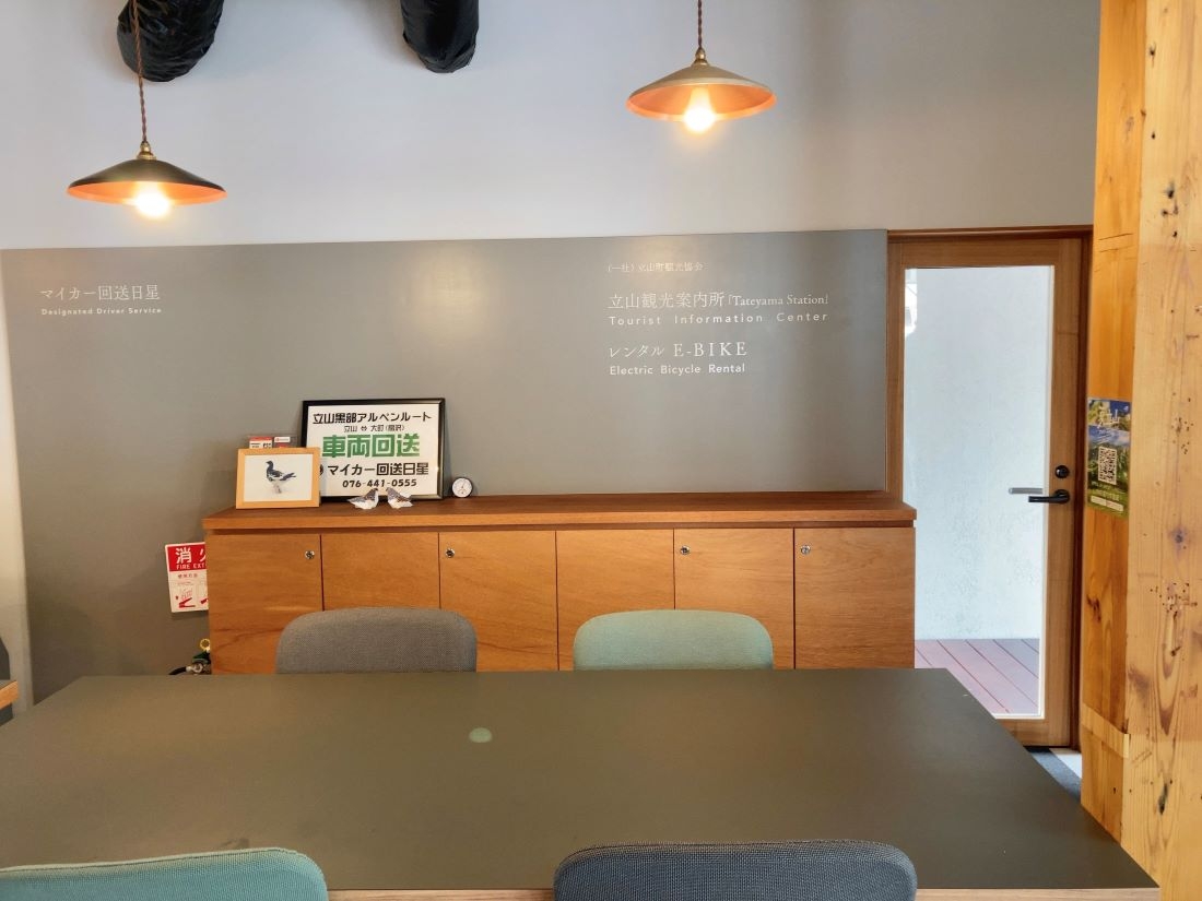 2022年10月、立山駅の目の前に、「LOCOMOTION COFFEE AND BED 」というカフェとゲストハウスが一体となったお店ができました。こちらには立山町観光協会の観光案内所も併設されており、レンタサイクルの貸出も行っています。