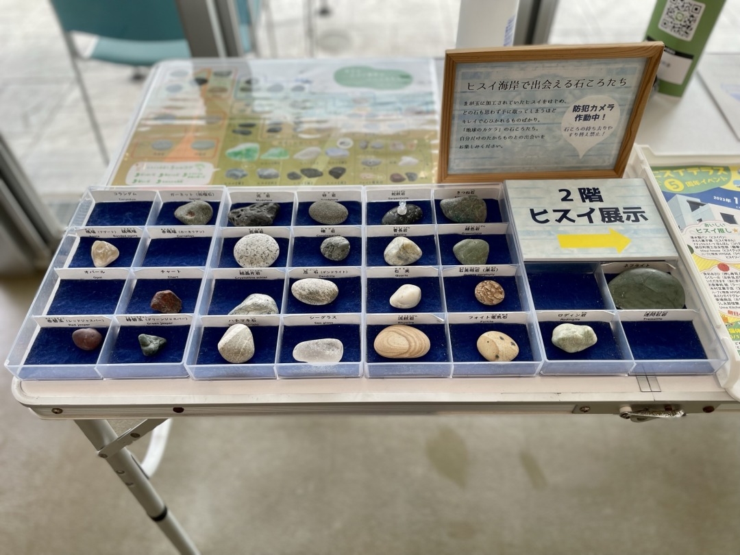 食後は、ヒスイ探しができる宮崎海岸へ。まずは「ヒスイテラス」に立ち寄って、パンフレットなどを通じてヒスイの理解を深めました。