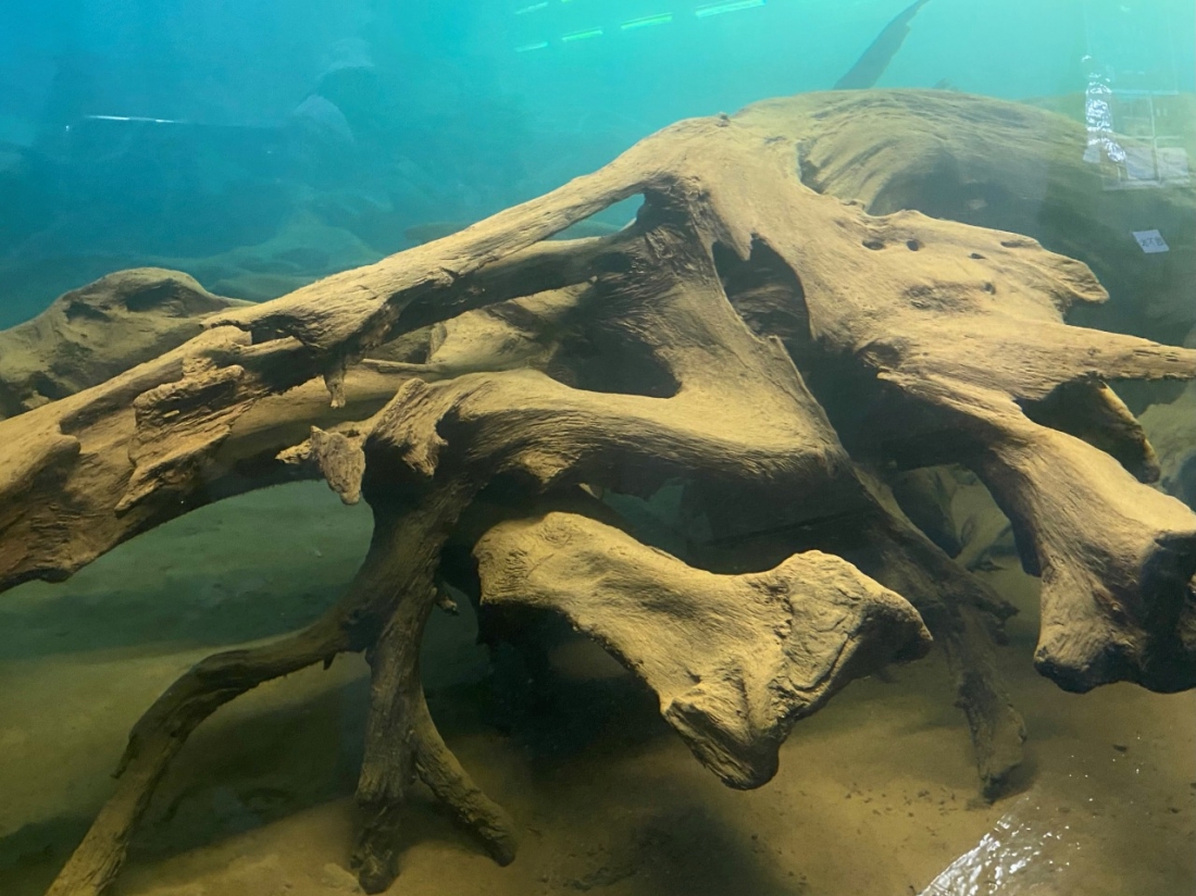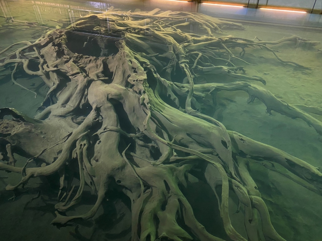いよいよ噂の埋没林のもとへ。こちらは水中展示館です。上から見る埋没林はすごい迫力でした!2000年も前の木の根っこがこんなに綺麗に保存されている事にびっくりしました。なお、この根っこは、国の特別天然記念物に指定されているそうです。