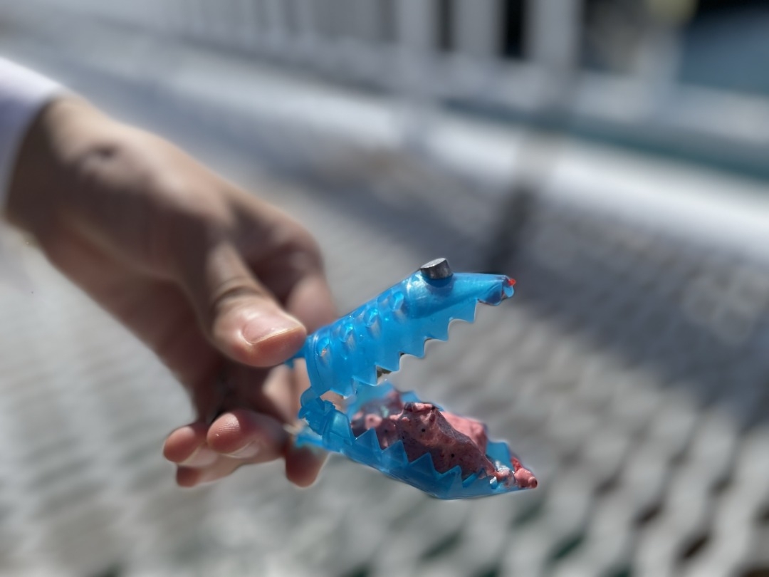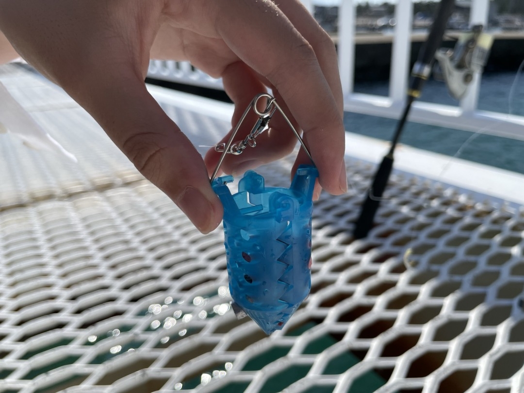 2.釣り糸を海の中に入れるときに、「撒き餌カゴ」から撒き餌(魚をおびき寄せる為のエサ)が、少しずつ出ていきます。