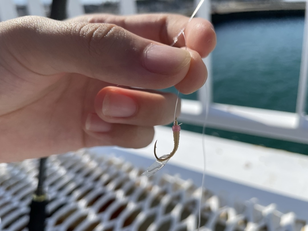 投げ釣りにもチャレンジしました。1つは餌にイソメを使用。イソメとは、釣りでよく使われる虫で、釣具店などで売られています。見た目はちょっとグロテスクですが、様々な魚が好んで食べるので、ぜひ使ってみてください。