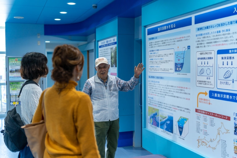 ここは、入善沖3キロ、水深384メートルから取水している、海洋深層水の給水施設。海洋深層水に関するパネルや映像展示がありますが、このプランではガイドさんがさらにわかりやすく解説してくれます。