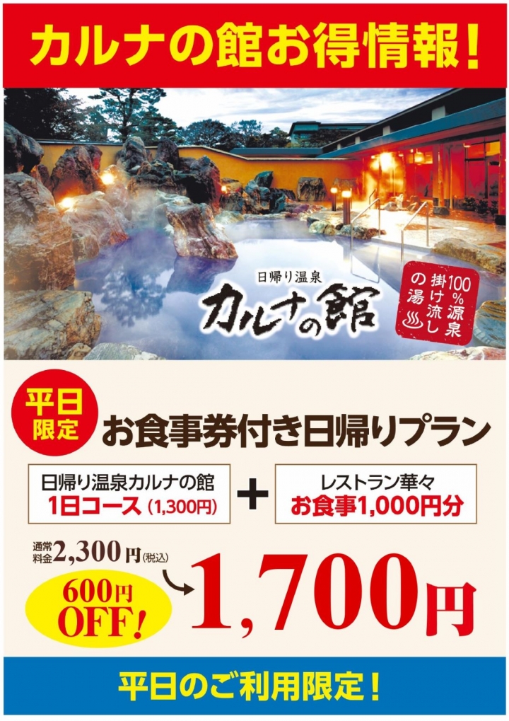 日帰り温泉カルナの館【1日コース】の入館料とレストラン華々「1,000円」お食事券をセットにした日帰り温泉プランを