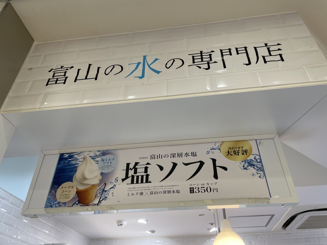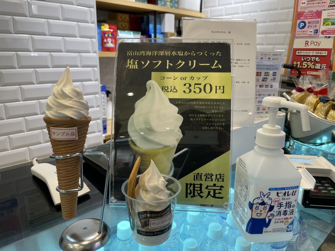 こんにちは、とやまめぐり編集部の曽我です。今回ご紹介するのは富山駅前の「とやマルシェ」に入ってすぐ左側にある「GOSHU」の「塩ソフトクリーム」です。