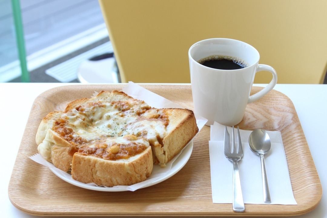 ファスナー作りの後はカフェに行き、ドリンクチケットでコーヒーを注文。ちょうどお昼の時間だったので、ガイドさんおすすめの自家製食パンを使った「土地っ子パン」の「カレー」を食べることにしました。