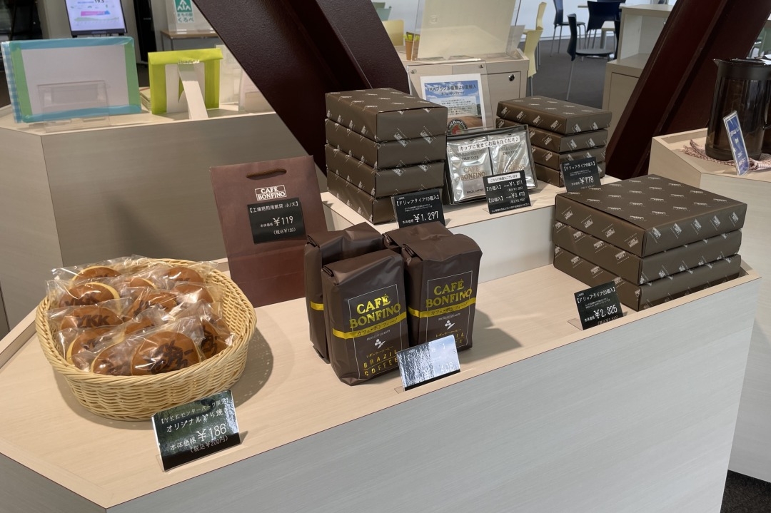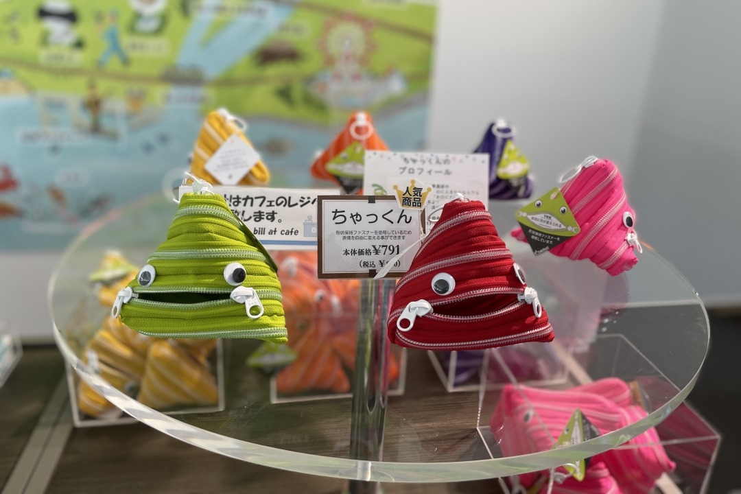カフェの入り口には、お土産コーナーがあります。ファスナーを使った様々なグッズやコーヒー豆が売られているので、ぜひ見てみてください。