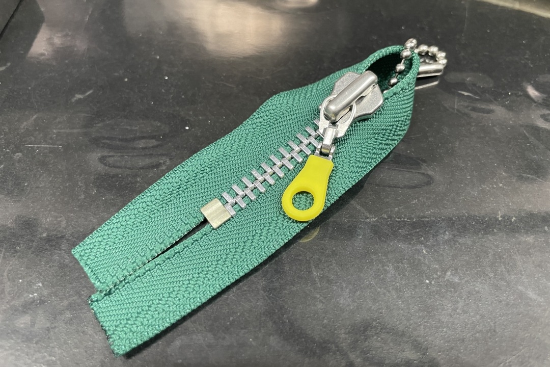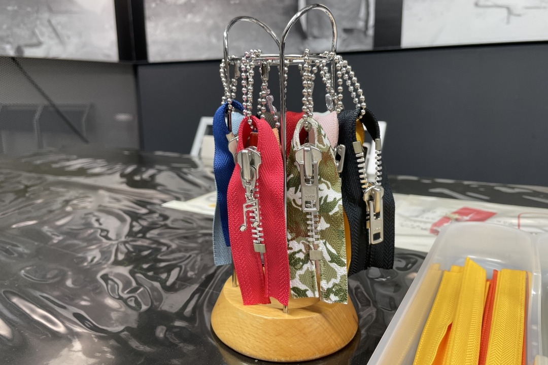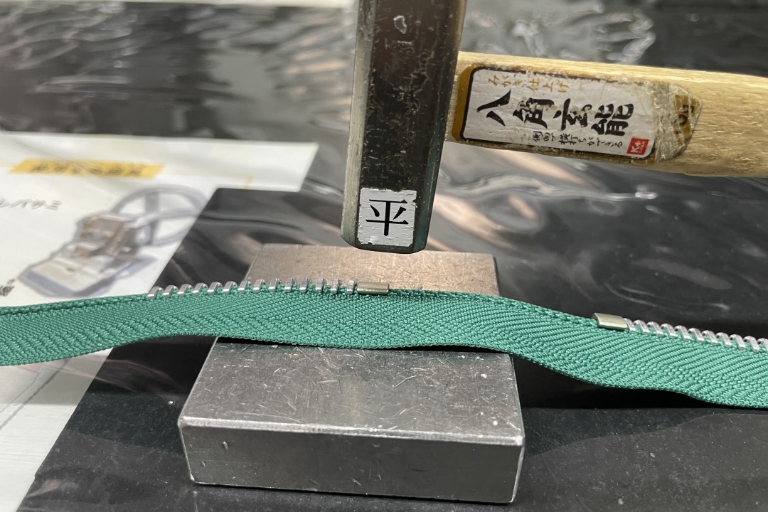 展示を見た後は「ファスナー手作り体験」へ。ガイドさんが、たくさんあるテープを出してくださり好きな色柄を選ぶことからスタート。その後、エレメントという小さな器具をひとつひとつ並べ、プレス機で押していただき、トンカチで上留めと下留めを叩いて完成させました。どの作業も興味深く、とても楽しかったです。