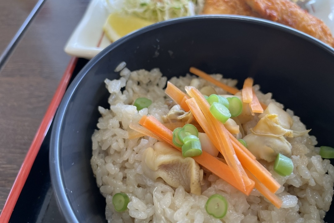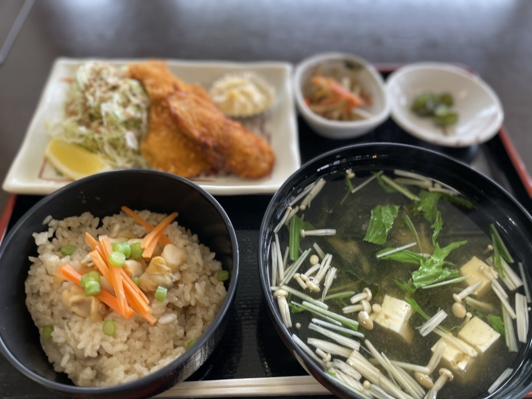「バイ飯」とは、バイ貝という北陸地方でとれる貝が入った、炊き込みご飯。絶妙の炊き加減のご飯は、貝のうまみが濃縮されており、口に入れるたびに幸せな気持ちが広がりました。バイ貝もたっぷり入っていて、さすが漁師飯!と感動しました。魚のフライ(この時はサワラと、ブリの幼魚の「フクラギ」)も絶妙の揚げ方でした。おつゆは驚きのどんぶり入りでしたが、昆布のお出汁がきいていて、気づいたら完食していました!