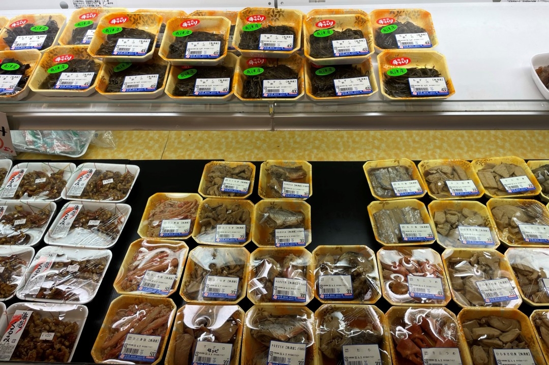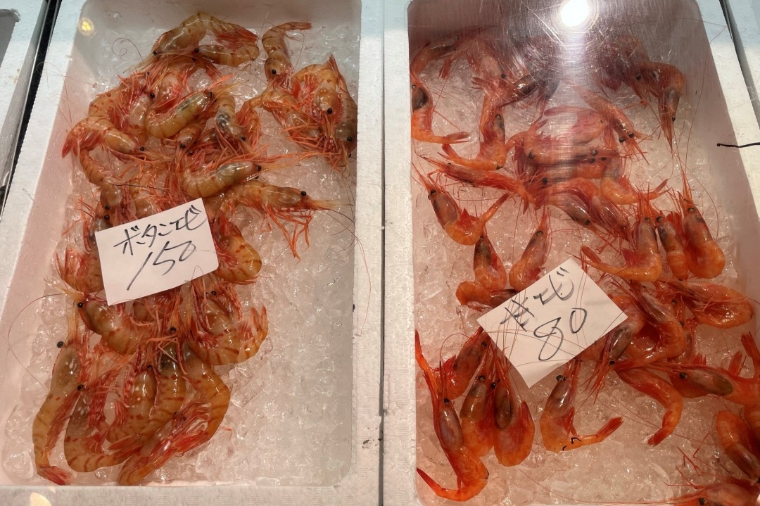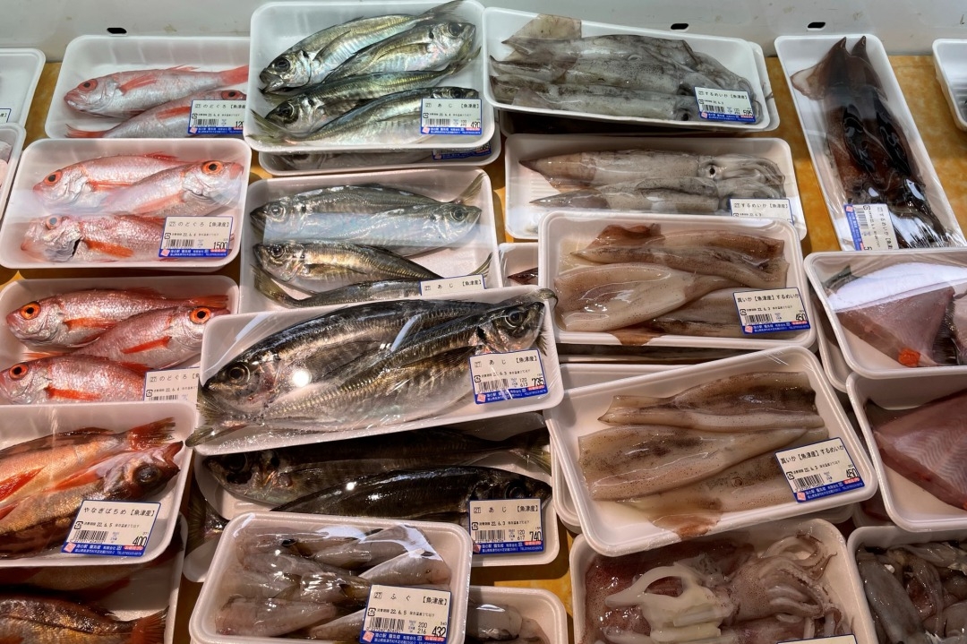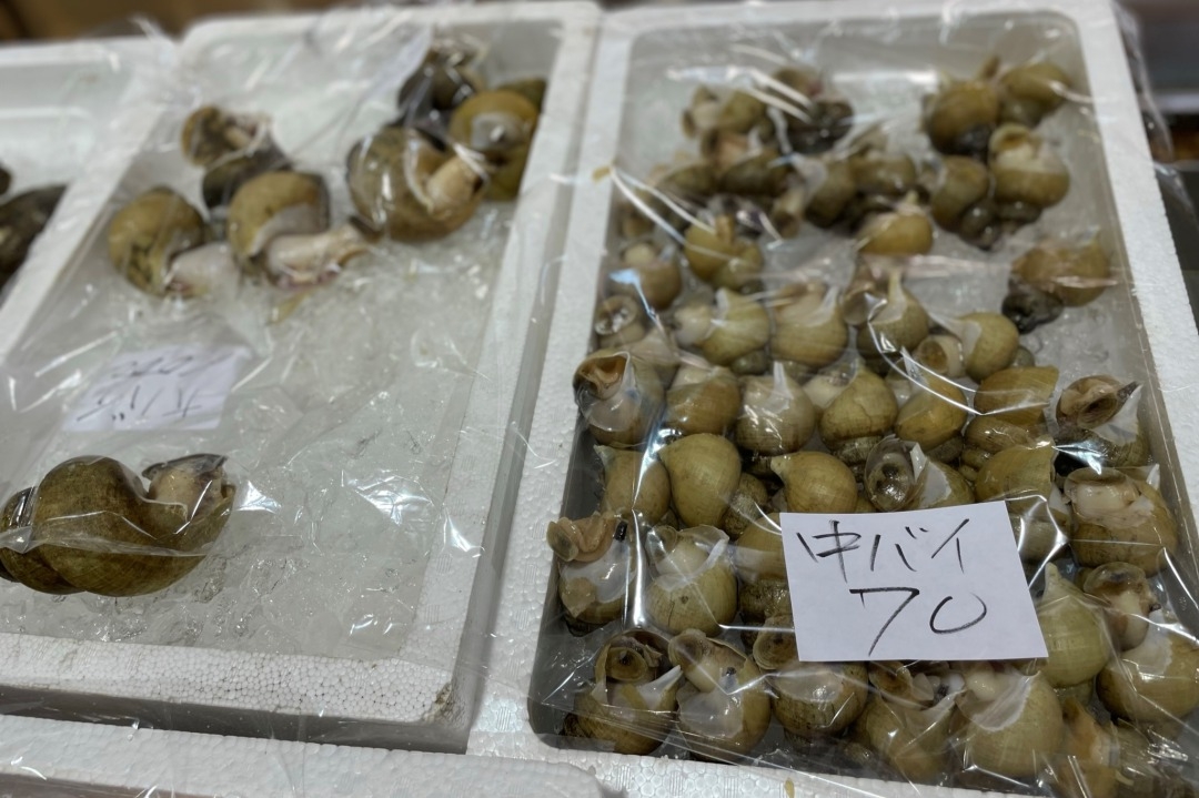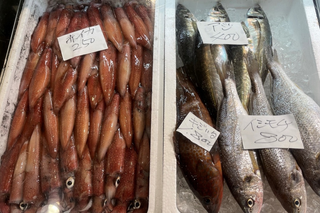 入口を入って目の前にある「忠 鮮魚店」は、魚津港で水揚げされたとれたての鮮魚が並ぶお店です。私が行った日(2022年6月上旬)は、赤イカやアジ、バイ貝などの魚介類と、特製のお惣菜がありました。
