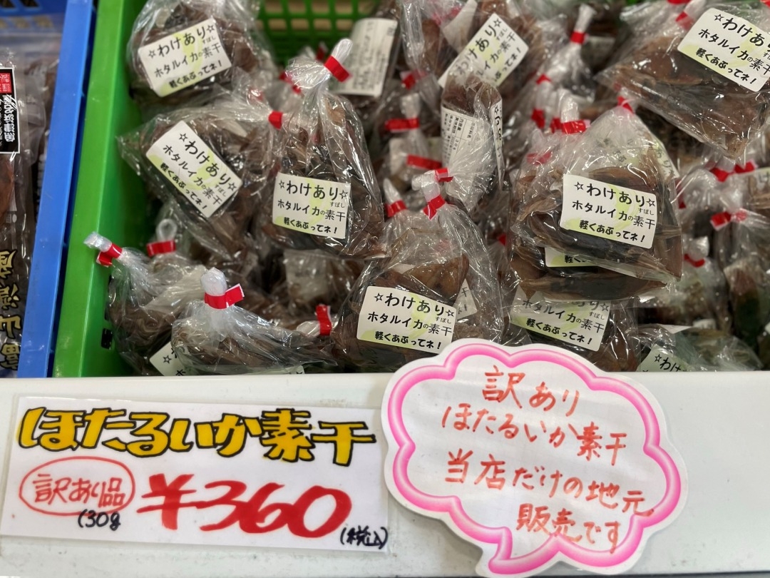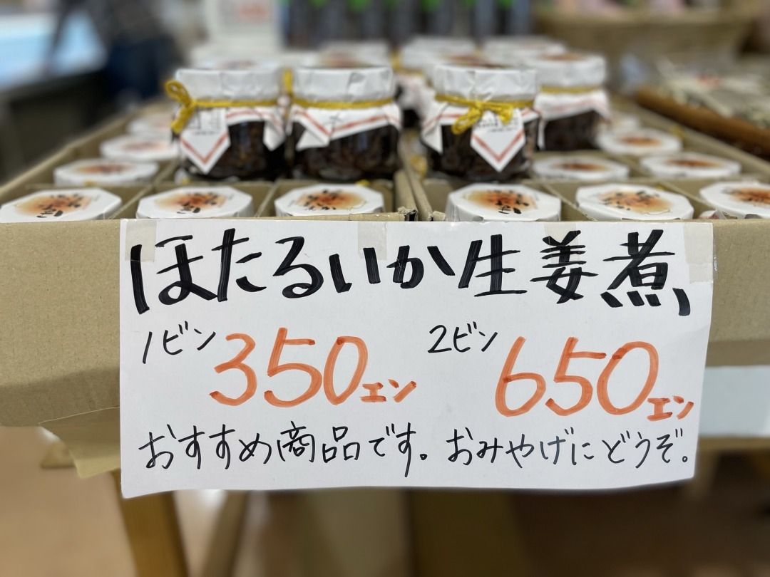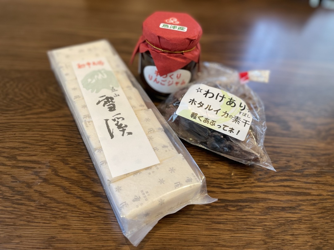 私がこの日買ったのは名物の「雪渓」とホタルイカの素干し(訳あり品で安い!)、地元の方が作ったりんごジャムです。どれも素材の良さが光る逸品ばかりでした!