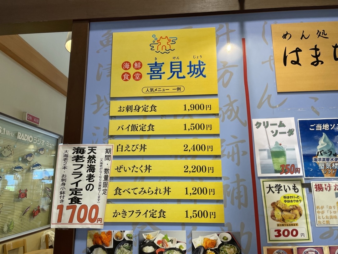 「海の駅蜃気楼」には、お食事処が2つあります。1つは「海鮮食堂 喜見城(きけんじょう)」。魚市場に近いからこそ味わえる、新鮮な魚介類を使った、ボリュームたっぷりでリーズナブルなお食事メニューが味わえます。