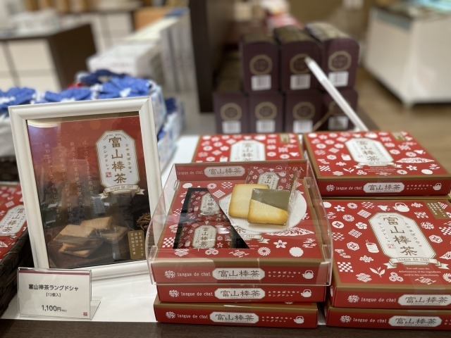富山を代表するお茶屋さん「藤岡園」のお菓子も、手に取る人が多い人気商品。特に、加賀棒茶を入れたラングドシャやブッセなどの洋風のお菓子を選ぶ方が多い、とのことです。