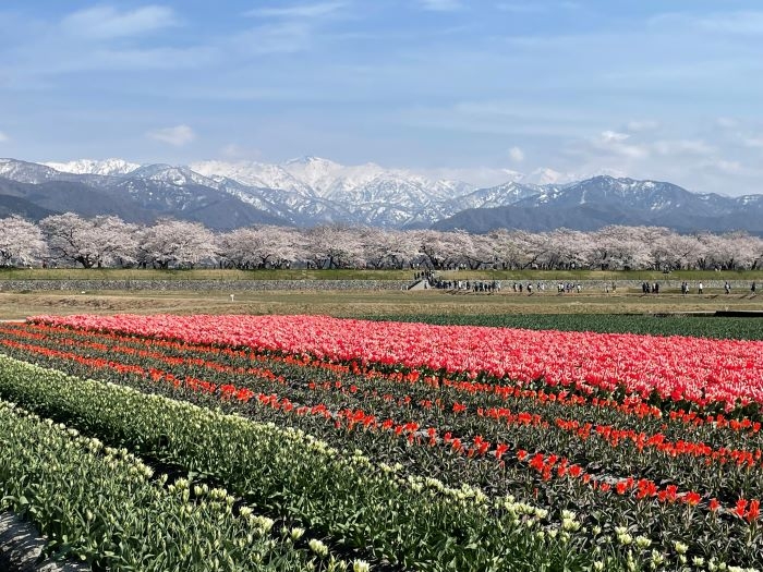 「残雪の朝日岳」「ソメイヨシノ」「チューリップ」「菜の花」が織りなす絶景の景色