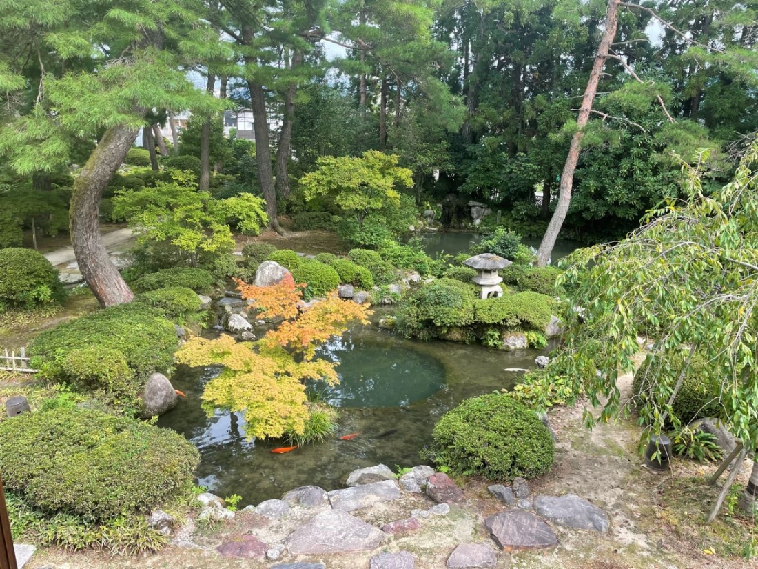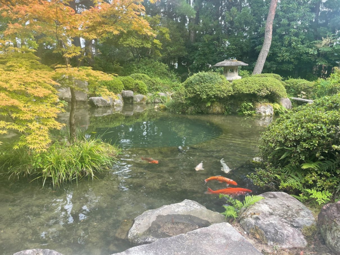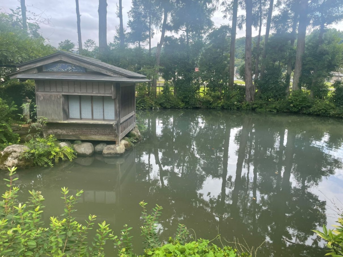 池には、数匹の鯉が泳いでおり優雅さが伺えます。また、池の真ん中に建てられた茶室も風流を感じさせます。