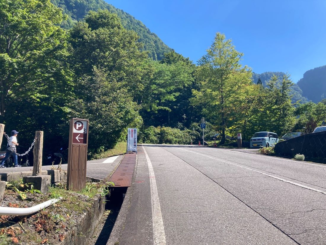 称名滝へは、「レストハウス称名」というお店まで自転車で走ることができ、そこから称名滝までは歩行者専用道路となるため歩いて向かいます。自動車でお越しの方は、レストハウス称名の手前に駐車場があるのでそちらにお停めいただけます。