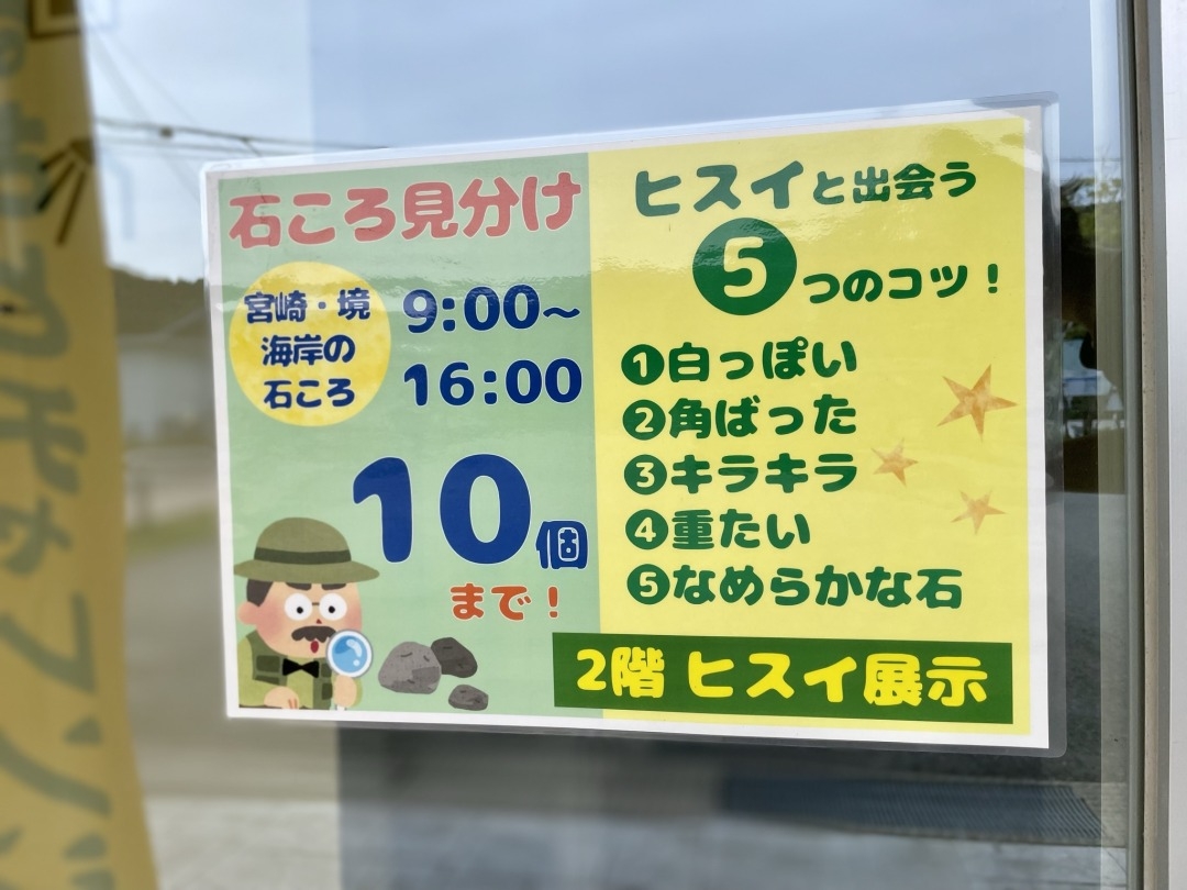 食後は、ヒスイ探しができる宮崎海岸へ。まずは「ヒスイテラス」に立ち寄って、パンフレットなどを通じてヒスイの理解を深めました。